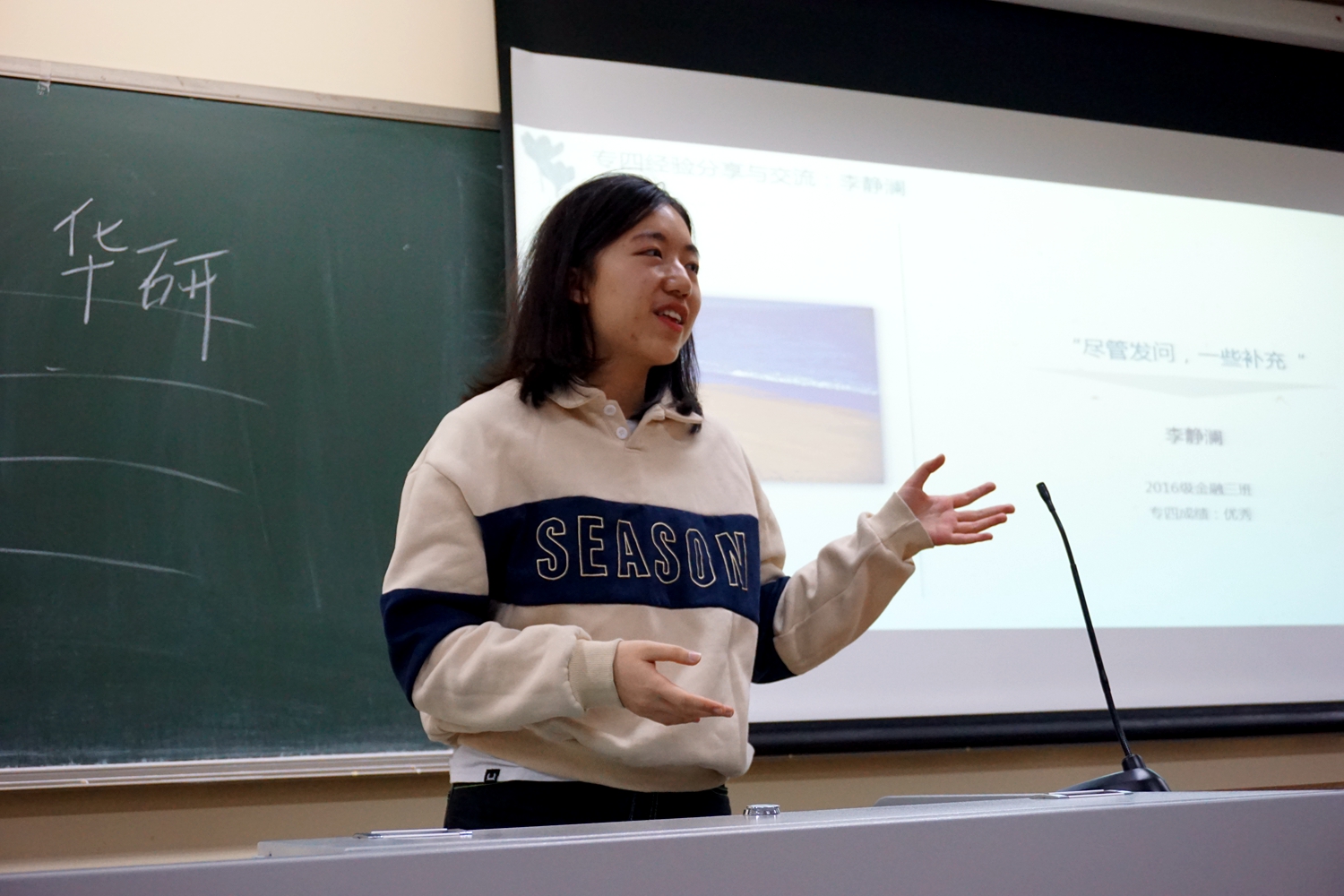 交流会中,首先进行英文迷你写作大赛颁奖仪式,邓会荟与国商团学联主席庞晓晨、学习部部长普钰雯分别为一、二、三等奖获得者颁奖并合影留念。随后,专四经验分享会开始。16级专四优秀学生王舒旻与李婧岚分别从阅读、听力、语法和写作四个方面向同学们简单介绍专四考试的四个部分,并分享自己的答题技巧。贺雨欣则以自己的学习历程为例,向同学们分享复习专四的经验并介绍专四考试题型。