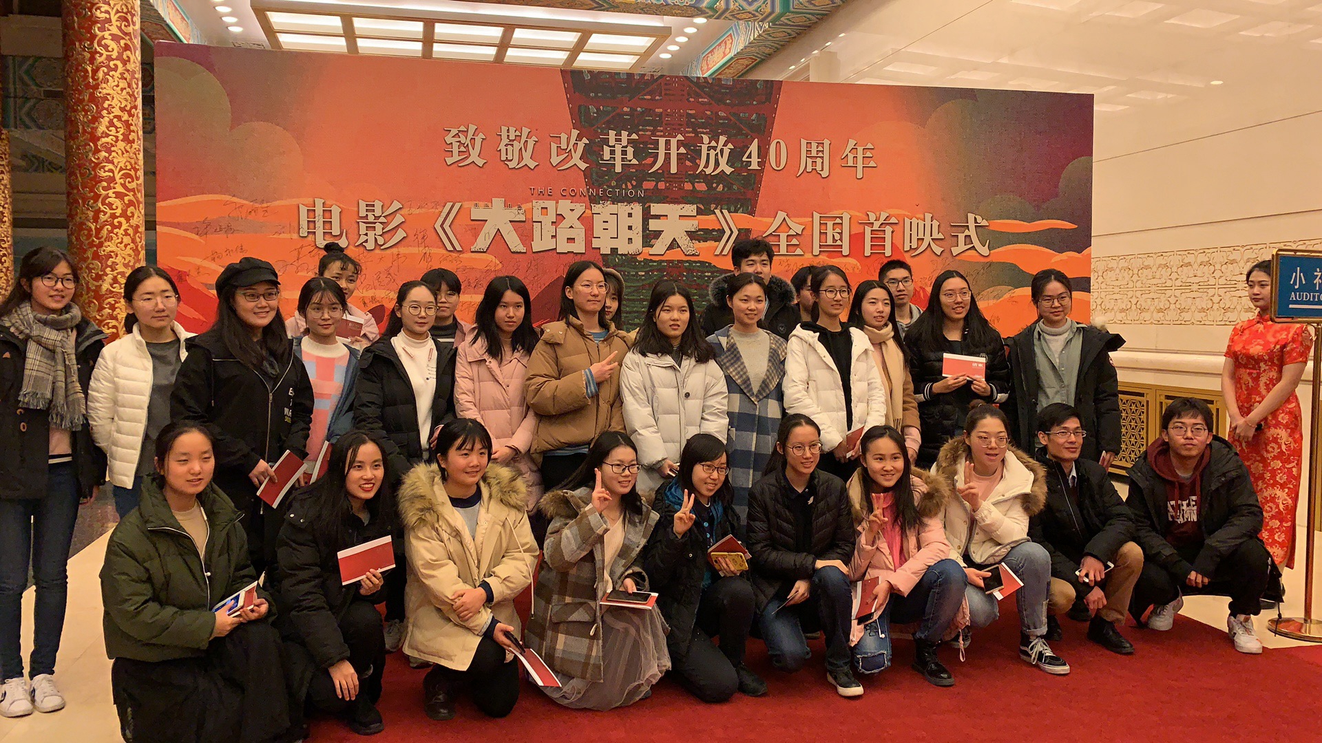 为响应学校纪念“改革开放四十周年”号召,应峨眉电影集团邀请,12月21日下午13点,国际商学院三十余名学生骨干在国际商学院留学生事务主管谈超、18级本科生辅导员王米川的带领下前往中华人民共和国中央政府人民大会堂小礼堂参加“庆祝改革开放四十周年电影《大路朝天》全国首映礼”。