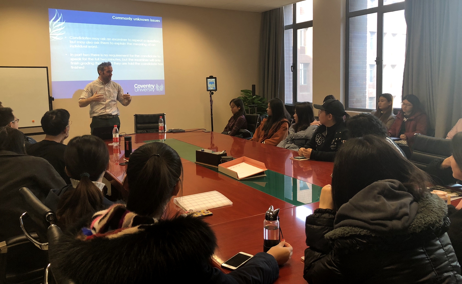 11月19日上午,英国考文垂大学英语教师、前雅思考官George Haughie来访国际商学院,为同学们备考雅思助力。George主要针对中国考生在雅思写作和口语中的常见误区进行深入剖析,并与同学们交流考试技巧与策略,提出有效的备考建议。同学们积极参与讨论,现场气氛热烈。