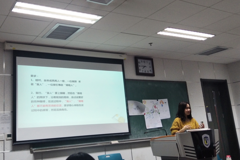 在接下来的环节,老师组织同学们和组内伙伴真诚互动,模拟盲人以及聋哑人,相互帮扶上下楼,同学们克服重重困难,帮助队友完成任务,从中学习如何换位思考,学会爱与帮助。