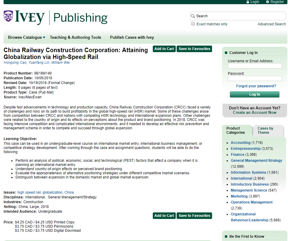 国际商学院曹鸿星副教授撰写的英文商科教学案例 "China Railway Construction Corporation: Attaining Globalization via High-Speed Rail" 被国际著名案例研究机构——毅伟商业案例库在线出版发行(案例编号:9B18M149)。这是国际商学院的第四篇入选案例,此次入选案例库,体现了国际商学院在高水平教学案例开发方面再次取得重要进展。