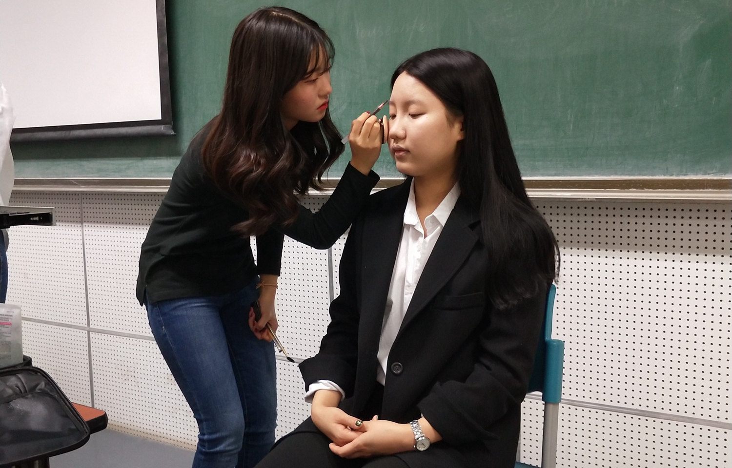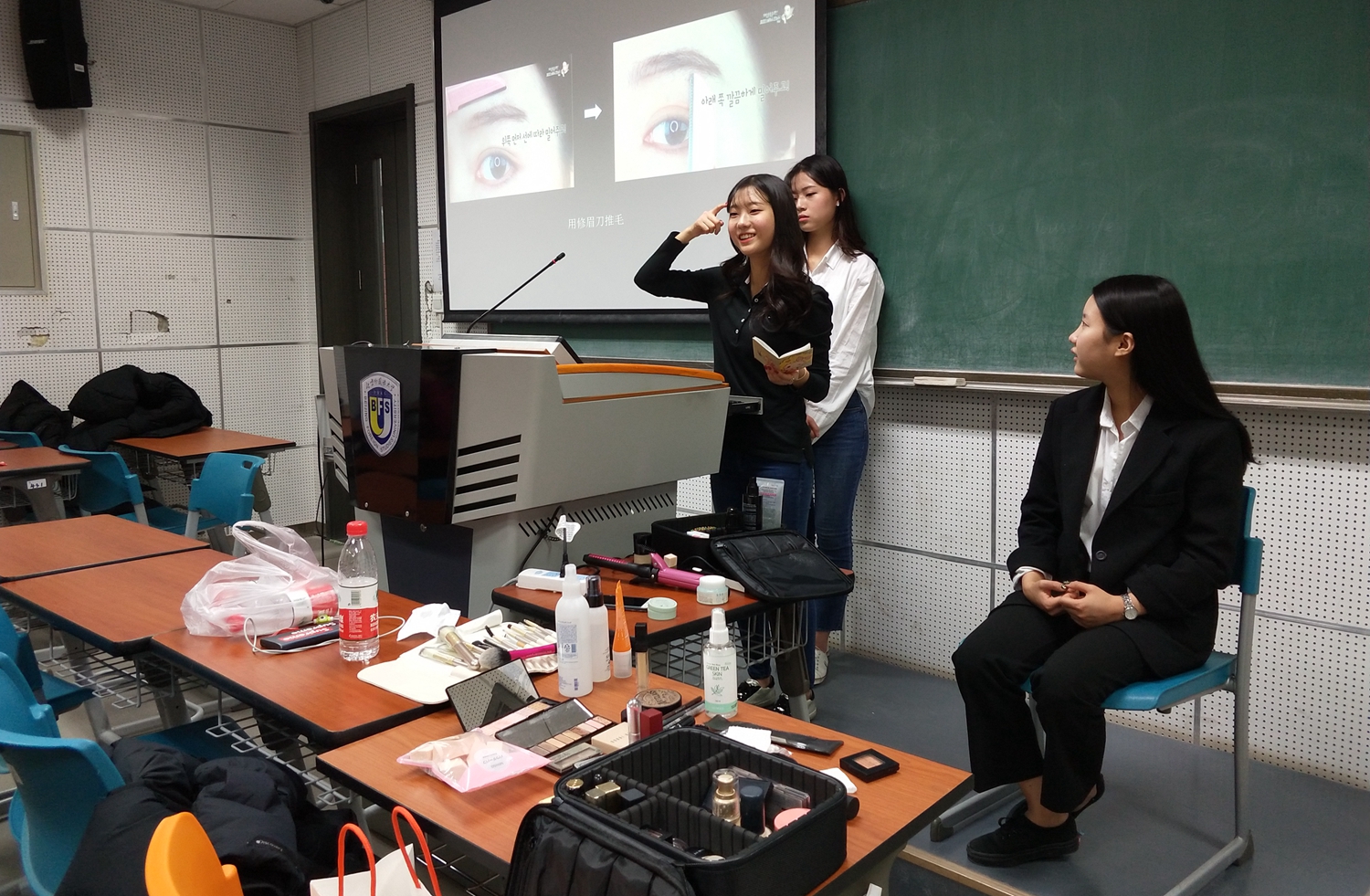 本次讲座邀请了两位韩国又松大学形象设计专业学生尹成湖和呉昇眞作为主讲人,分别对职场妆容和发型设计进行讲解与示范。