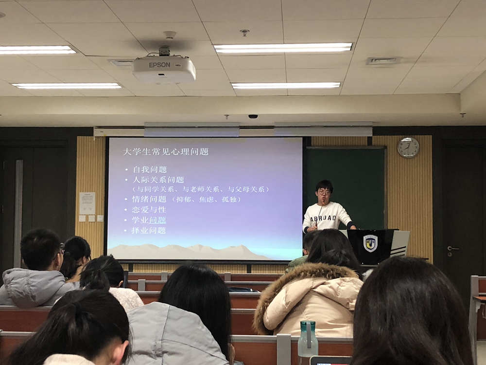 讲座开始,老师首先向同学们解释了大学生心理问题的含义,随后通过马斯洛的需求层次理论对心理问题进行进一步分析。最后,他谈到当今大学生中人际关系、恋爱与性、学业、择业等常见问题,告诉同学们通过心理防御机制、改变认知、寻求支持以及适当的运动等方式可以帮助同学们调节情绪、促进心理健康发展。