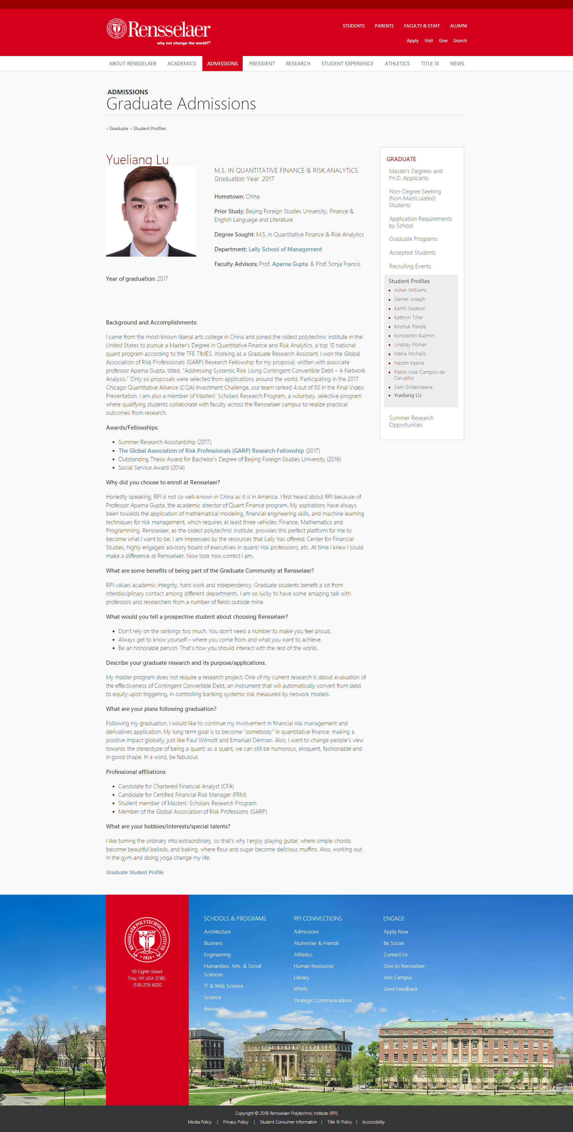 逯玥良在国际商学院学习期间,刻苦努力,成绩优异,曾获得北京外国语大学本科优秀毕业论文奖。毕业后,他前往美国 Rensselaer Polytechnic Institute 攻读金融工程硕士学位,在读期间被选为该校 Outstanding Graduate Scholar,这是该年度唯一一位获得此殊荣的硕士研究生(具体可见 https://admissions.rpi.edu/content/yueliang-lu)。目前他已获得 University of North Carolina at Charlotte (UNC Charlotte) 全额奖学金,并将于今年9月前往该校 Belk College of Business 攻读数量金融博士学位。