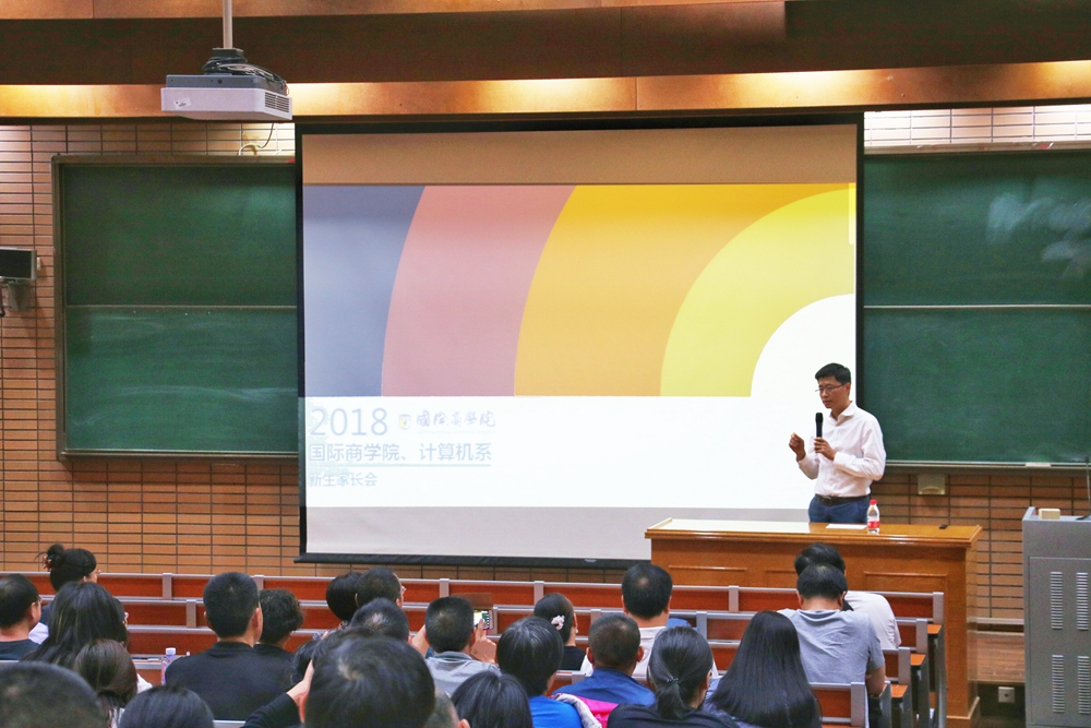 当天下午,学院在逸夫楼一阶梯教室举办两场分别以大学生活陪伴与危机应对、院系情况介绍为主题的新生家长会。国际商学院院长牛华勇,国际商学院党总支书记、副院长刘鹏,北京外国语大学计算机系主任蔡连侨,国际商学院院长助理崔校宁,校团委副书记、学生事务办公室主任李文斌出席并分别发表讲话。