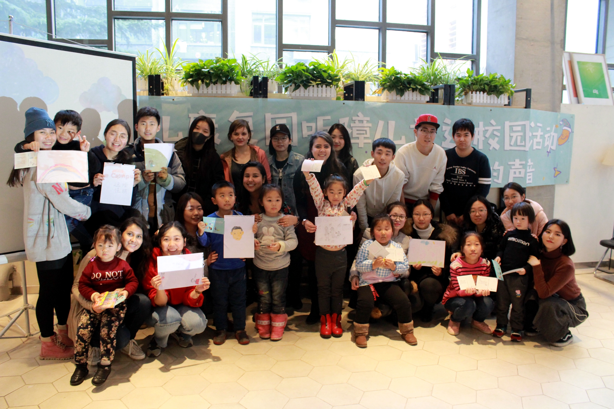 12月6日下午,由共青团北京外国语大学委员会主办,国际商学院党总支、国际商学院团学联承办的听见你的声音海伦聋儿康复园听障儿童进校园活动在北外当绿咖啡馆举办。来自康复园的3位老师8位小朋友与20名中外志愿者参与了本次活动。