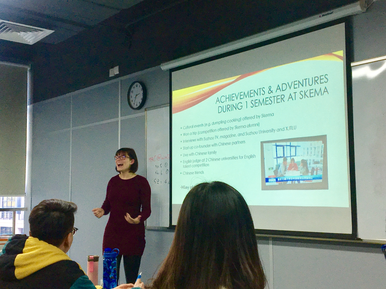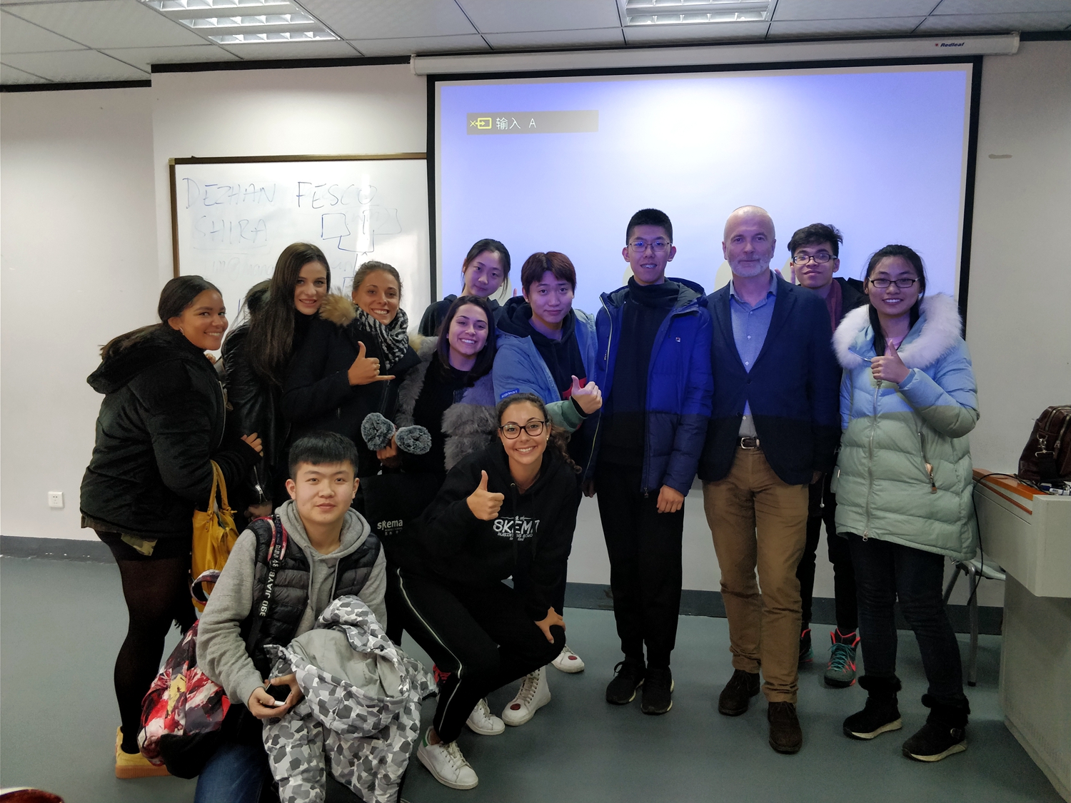 冬令营第二天,同学们随SKEMA工商管理学生参加了“LEGAL ISSUES”课程,通过和国外学生合作完成任务,同学们体验了中西方课堂的区别、法国商学院的教学模式,更深刻地认识到了辩论精神、团队合作、以及主动学习的重要性。SKEMA一位德国毕业生关于“HAPPINESS” 讲座让学生们了解了商学院校园生活、学生组织、积极的学习态度;林教授的关于职业规划的讲座使同学们对自己的职业选择与规划有了清晰的认识。