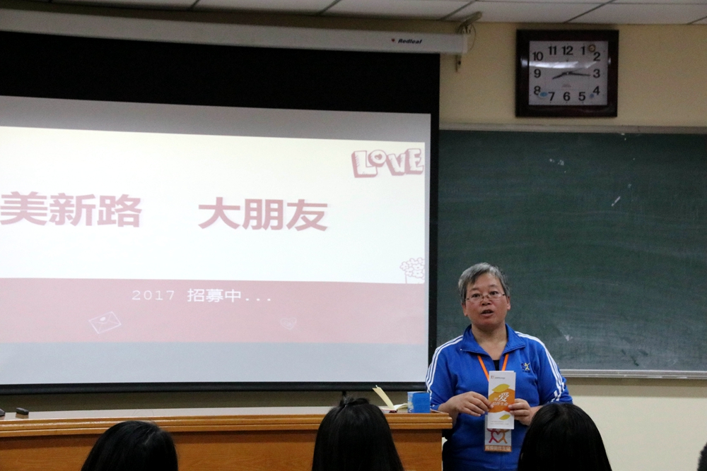 井春老师首先对美新路大朋友志愿项目内容做了详细的介绍。即美新路大朋友志愿项目是“美新路公益基金会”的主要项目之一,致力于对青少年一对一的长期心灵关怀。在这个项目中,志愿者将和初中同学一对一结成对子,以书信和见面相结合的方式进行交流,传递关爱,建立友谊。并且井春老师还分享了她作为志愿者与小朋友交流相处的经验以及在这过程中发生的温暖故事。