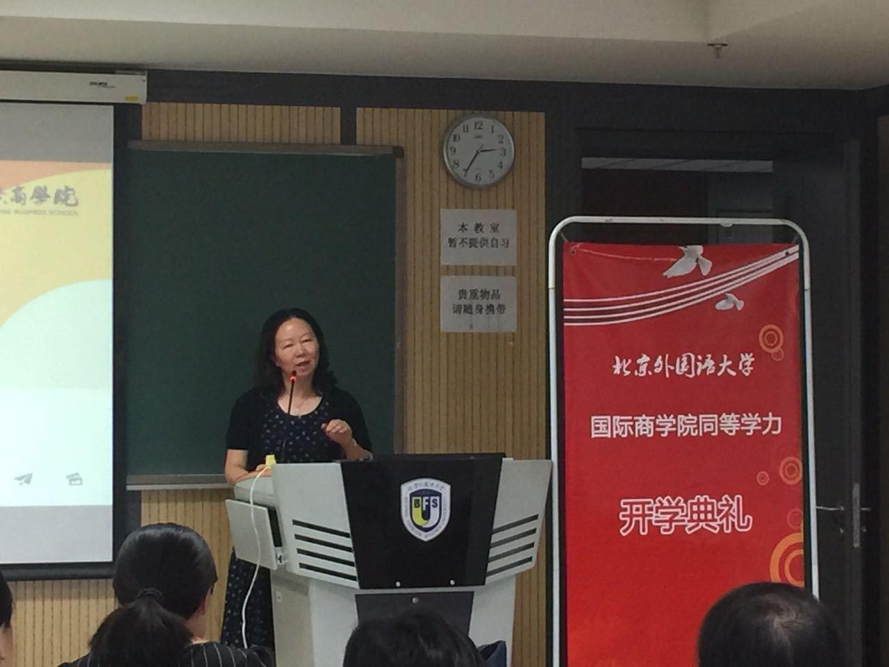 孙文莉发表致辞,介绍了北京外国语大学以及国际商学院的发展历史以及取得的成就。国际商学院经过多年的发展,目前各项工作开展顺利,并且都取得了长足的进步,同学们能够在北外学习到许多新的知识,学习北外国商的精神,希望同学们能够在北外好好学习,并祝同学们学业顺利。