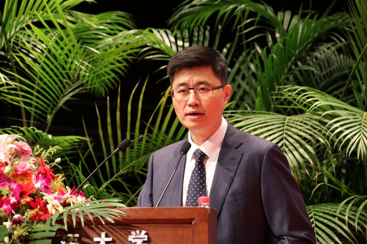 刘鹏致辞,介绍了商学院的历史,鼓励新生们利用商学院的资源,努力发展自己。(党总支书记刘鹏在2017级新生开学典礼上的发言)
