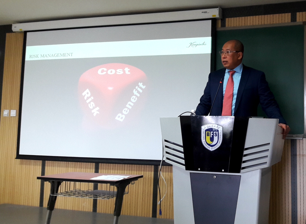 4月11日上午,国际商学院教师王德宏邀请到凯宾斯基酒店中国区财务副总裁杨思幸,为2014级金融系学生带来了“Risk Management in Hospitality Industry”的课程讲座。讲座旨在加深同学们对风险管理与保险这门课程知识的理解,并对酒店业风险管理有所了解。