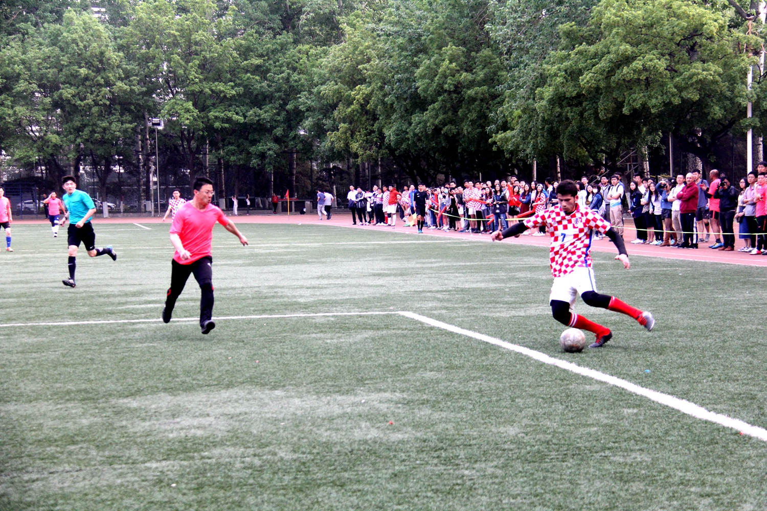 4月17日下午16:30,“北外杯”足球赛决赛在足球场如期举行。国商男足以5:1战胜教工,摘得桂冠。