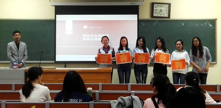 4月16日下午三点半至五点,国际商学院团总支于逸夫楼202教室举办了2016-2017春季学期优秀志愿者颁奖仪式暨志愿分享会。国际商学院团总支书记宋冰玉老师、团总支常务副书记尹芷璇、团总支成员及志愿者代表出席了这次会议。