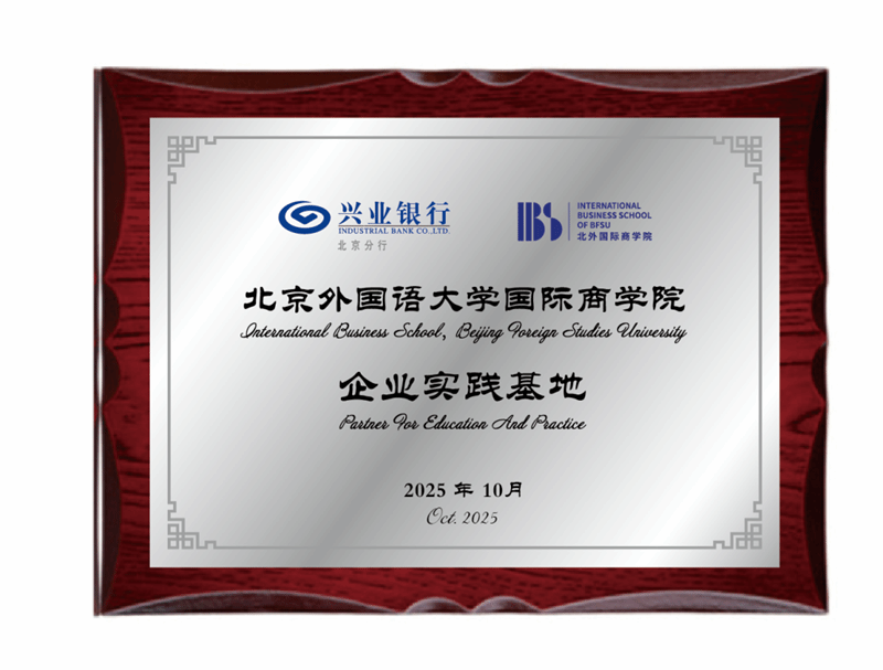 10月26日,北京外国语大学国际商学院与兴业银行北京分行签署了战略合作备忘录,并向兴业银行北京分行颁授“北京外国语大学国际商学院企业实践基地”牌匾。本着“优势互补、资源共享、互惠双赢、共同发展”的原则,学院与企业将在人才培养、科学研究、社会服务等方面进行全方位的合作,积极探索校企合作的新模式。