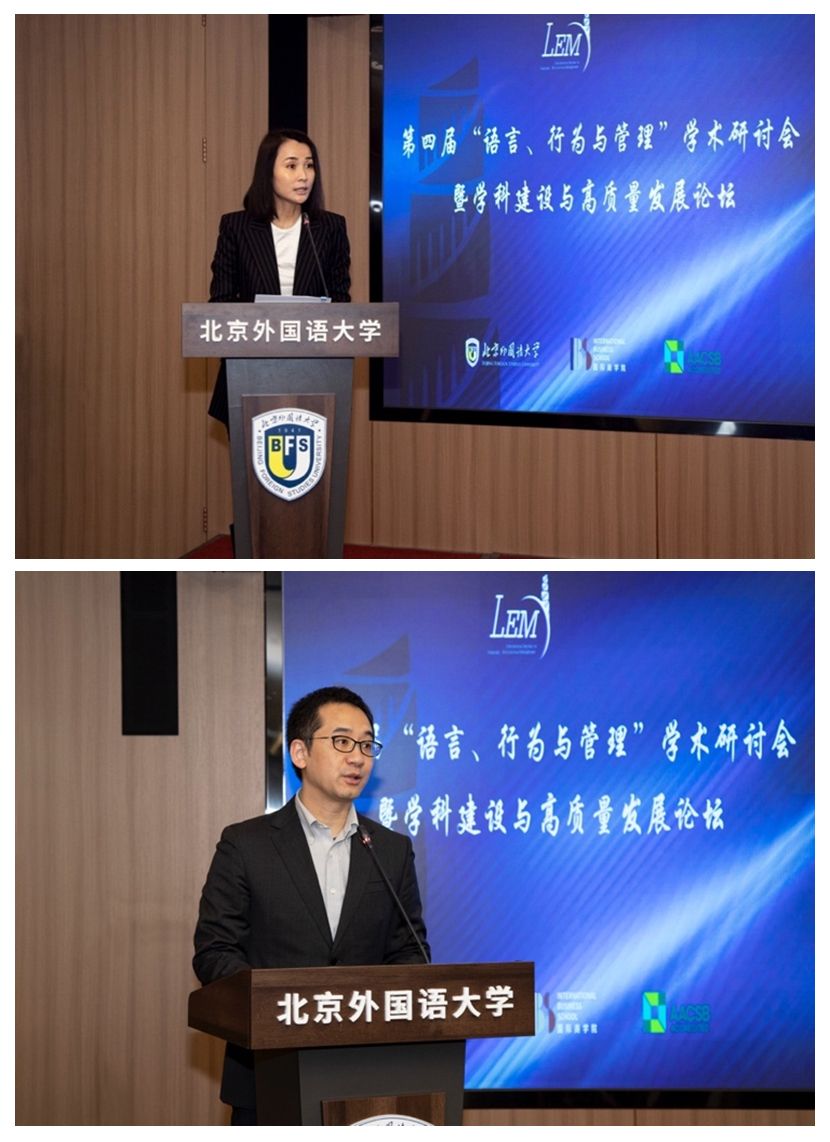 会议开幕式由北京外国语大学国际商学院副院长邵明星主持。国际商学院常务副院长李思飞为会议致辞。李思飞介绍了北京外国语大学和国际商学院的发展概况和学科优势,指出全球化和人工智能发展为语言与管理学交叉研究提供可行性。他表示国际商学院将持续发挥平台作用,搭建跨学科沟通桥梁。