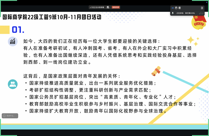 本次团课由工管九班团支书陈忆琳带领开展,从时代背景、青年使命、政策导向三个方面入手,深入解读了当下青年所处的时代环境,重点分析了当前国家在教育改革、新质生产力发展、人才强国战略等方面的重要部署,并结合考研、考公、就业、出国深造等多种毕业路径,为同学们提供思路指引。团支书强调,新时代高校青年应把个人理想与国家战略紧密结合,在多元选择中作出属于新时代青年的“最优解”。
