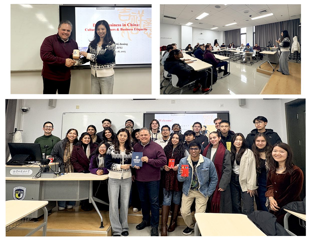 10时至11时,北京外国语大学国际商学院宋泽宁教授为来访师生作题为 “Doing Business in China” 的专题讲座。宋教授围绕中国商务环境与商业文化展开介绍,从沟通方式、决策逻辑等方面系统讲解了中国商务文化的特点,并通过案例分析对比了中西方在商务实践中的差异,帮助来访学生更好地理解在中国开展商业活动所需的文化与实践背景。讲座结束后,双方进行了现场问答交流,气氛热烈。