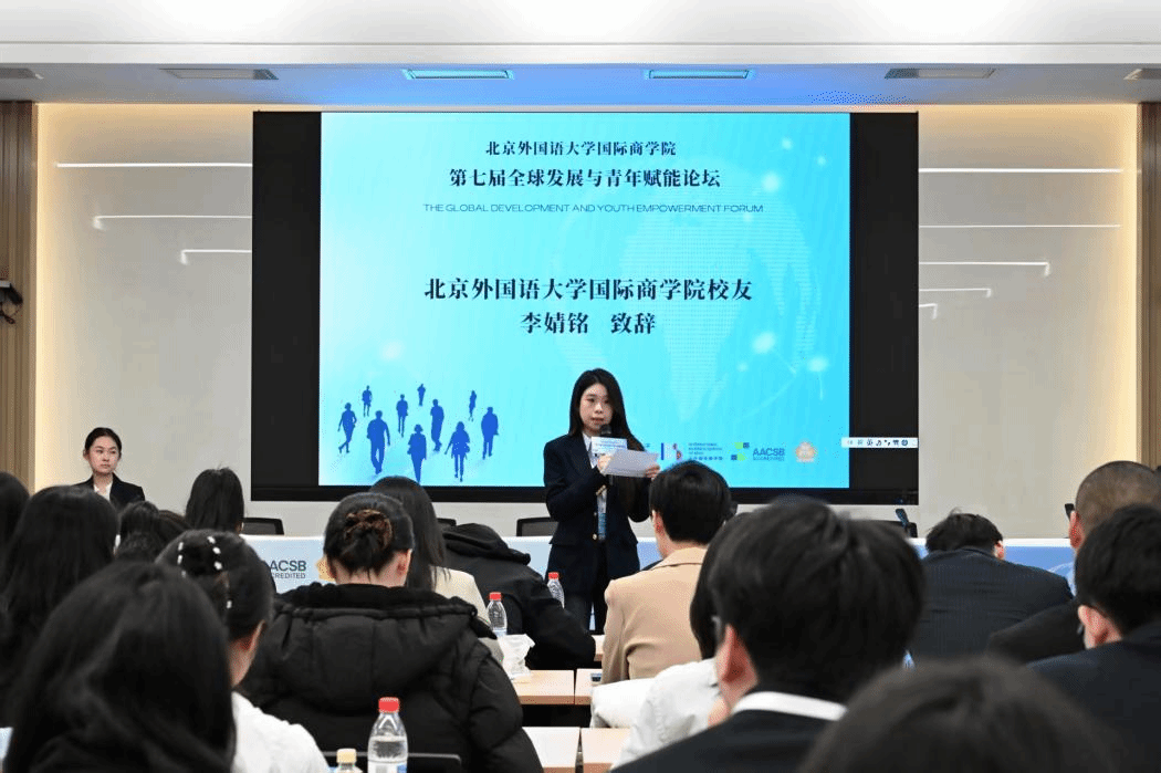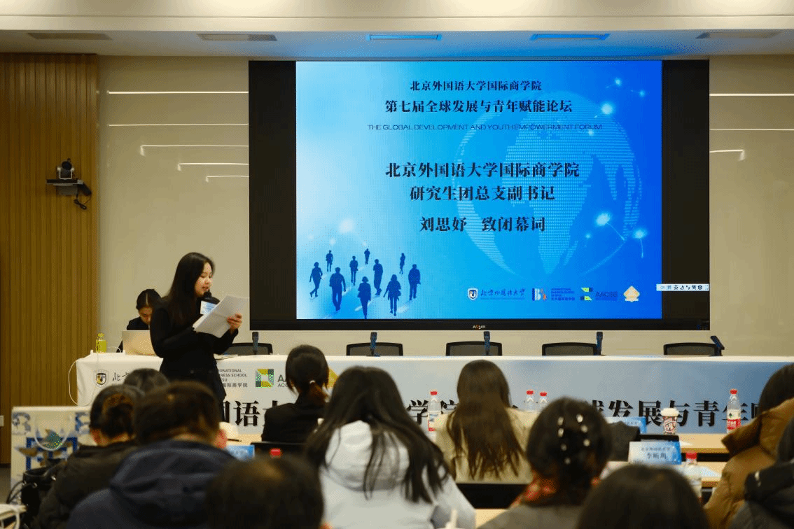 最后,国际商学院研究生团总支副书记刘思妤同学致闭幕词。她代表学院向所有与会嘉宾致以诚挚谢意,并号召青年学子以智慧与行动投身未来全球发展进程。至此,北京外国语大学国际商学院第七届全球发展与青年赋能论坛圆满结束。