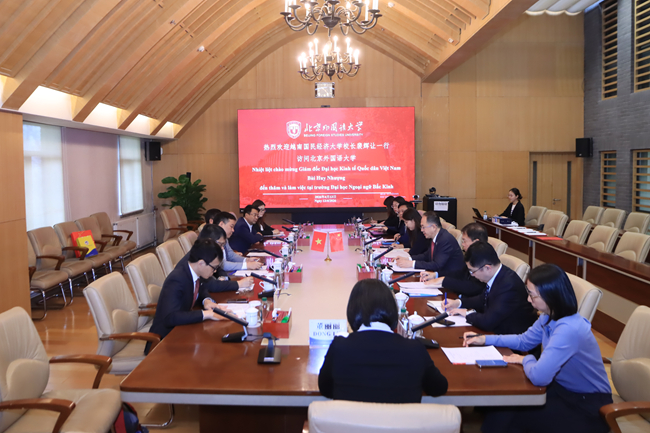 越南国民经济大学商学院、高级教育学院、人事处、国际交流处代表,北外国际商学院、人事处、教育学院、教务处、国际交流与合作处负责同志参加会见。