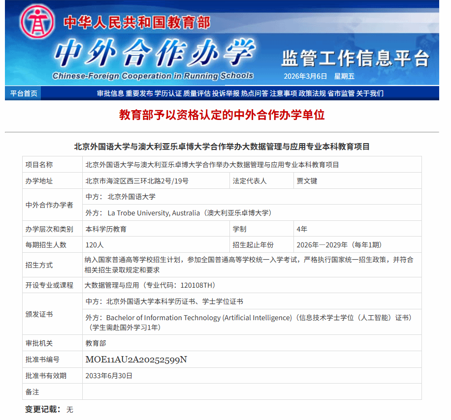 为顺应全球数字经济与人工智能快速发展的时代趋势,服务国家数字中国战略和中资企业国际化发展需求,北京外国语大学与澳大利亚乐卓博大学合作举办大数据管理与应用专业本科教育项目(教育部批准书编号:MOE11AU2A20252599N)。依托北京外国语大学的国际化办学优势,项目注重培养学生在全球商业环境中的数据应用能力与跨文化沟通能力,致力于培养兼具数据技术、管理思维与国际胜任力的复合型数字化人才。
